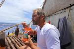 (2015-11-11) The two rafts of the Kon-Tiki2 Expedition met at sea today, and people, skills and material goods moved between the rafts. The first picture shows Boris and Pål swimming between rafts. In the second picture, Captain Kari greets the other raft (du kan lese bloggen hennes). In the third picure, Signe is thankful for a cold beer, brought from the all-male raft. We also caught fish today! The pictures don't tell the full story, but Jostein, Cecilie, Pål and Esteban are excited to have more proteins on the raft. Meanwhile, Ola and Gunvor fixes sails.