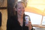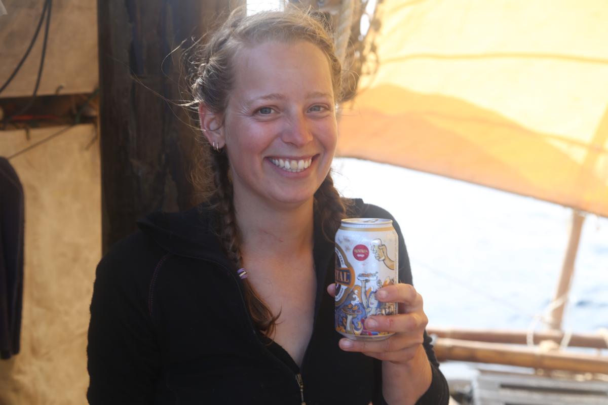 (2015-11-11) The two rafts of the Kon-Tiki2 Expedition met at sea today, and people, skills and material goods moved between the rafts. The first picture shows Boris and Pål swimming between rafts. In the second picture, Captain Kari greets the other raft (du kan lese bloggen hennes). In the third picure, Signe is thankful for a cold beer, brought from the all-male raft. We also caught fish today! The pictures don't tell the full story, but Jostein, Cecilie, Pål and Esteban are excited to have more proteins on the raft. Meanwhile, Ola and Gunvor fixes sails.
